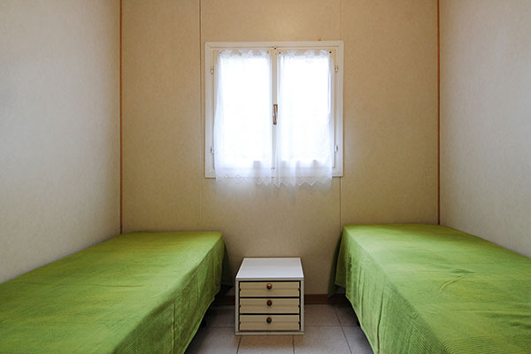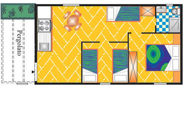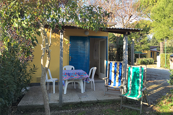 Comprende camera matrimoniale, cameretta con due letti singoli, soggiorno-pranzo con angolo cottura completo di lavello e frigo, servizio wc con lavandino e doccia calda, aria condizionata, veranda con pergolato, giardino e parcheggio auto riservato coperto. Completamente arredato compresa attrezzatura da cucina. Possibilità di un quinto posto letto in soggiorno: € 15,00 al giorno o 80,00 a settimana.